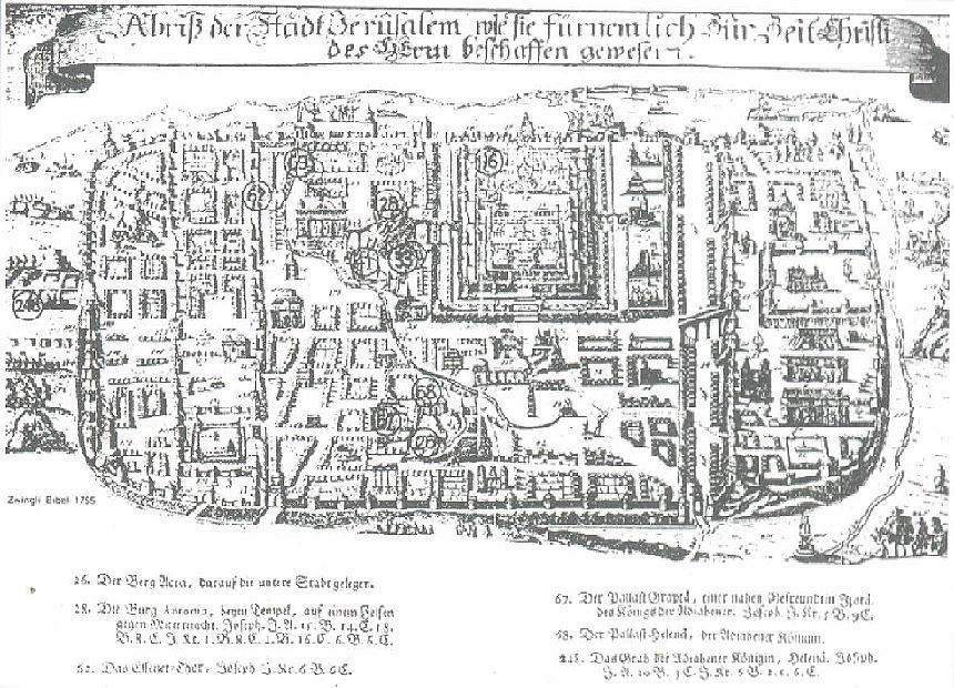 A fenti térképet átvettem az 1755-ben, Svájcban kiadott „Zwingli Bibliából”. Itt a 67. számmal van megjelölve a „Grapte-Kharax pártos herceg család (Mária édesanyjának) palotája, akinek a sírját a 2148. szám mutatja” - Ez a térkép annak is bizonyítéka, hogy az ún. „Zwingli-féle reformáció tagadta Máris és Jézus zsidó voltát, és éppen ez volt az ok, hogy „kitértek” a római júdai-kereszténységből és a kereszténységet „reformálni” (átalakítani) akarták, minden júdaiság elhagyásával.” És ne felejtsük el az évszámot: Kr.u. 1755! Azóta azonban a júdai-kereszténységnek sikerült véglegesen eltüntetni ezt a „reformációs” törekvést. Kiderült tehát, hogy a Pártos birodalom királyai nemcsak a biblikusan Galileának és Szamariának nevezett területekre, hanem Júdeára és így Jeruzsálemre is kiterjesztették hatalmukat; hiszen éppen Heródessel szemben Aristobolo „Hasmoneus II.-t” teszik meg Júdea királyává és Heródes apja és testvére a Galileának nevezett Adiabene tartományba mennek tárgyalni Adiabene herceggel, aki ott pártus helytartó volt. Teljesen érthető tehát, hogy Jeruzsálemben is volt palotájuk. Az Adiabene családról a „Toledot Jesú” című szövegben ez olvasható: „Adiabene Helen királynőnek volt egy Mirjam nevű, szűzhajadon rokona, akinek igen nagy vagyona és földbirtokai voltak. Mellette állt az Adiebene családhoz tartozó Yusef Pandar nevű fiatalember rokona, aki szintén nagyon gazdag volt, de anyja nem származott királyi vérből”