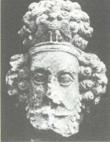 A „Szent Sólyom" előtt látjuk a „Fény Szentháromságának" a két „standardját". vagyis „törvényt adó" szimbólumait. A csúcson lévő sólyom jelzi a Szentlélek jelenlétét, az alatta ábrázolt „Fény Anya" és a mellette - a másikon - a „Fény Fia" felett. Az alattuk lévő két egybefont, kör alakú ábrázolás az „Égi és Földi Törvény" egységének a jelképe. Itt mutatom be Sanaturk pártus király fejét, a szent sólyommal koronáján. Mindkettő a Hatra-i templom romjai alól került elő a következő harmadik domborművel, mely mindent elmond a beavatottaknak a Pártus Birodalom államvallásáról. De ezeket a csodálatos bizonyítékokat a zsidó-kereszténység érdekű történelemírás elrejti. A „felső világ" vezetett nyomukra. Az alsó képen látható dombormű jelképezi az uralkodó pár hivatását. Főalak a király és mellette a háttérben, a két oroszlános trónon ülő királyné. Mindkeltő fején, a koronán ott van a „szent sólyom" a karizmatikus küldetést jelképezve. A király kezében az „Al-An" az „égi fokos", a „szövetség", a „munka" és a „védelem" jelképe. Balkeze a kard markolatán és pórázon fogja a háromfejű kutyát (a római „cerberust"), mely fölött egy tekergő kígyó van és afölött egy skorpió. Ékes ábrázolása ez a jobbján lévő, vallási standarddal kifejezett „államvallás" védelmezésének. - Ugyanis mindhárom dombormű a Kr. u. 2. század elejéről származik Hatrából. Ebben az időben még tombol a rómaiak kegyetlensége, a „keresztényüldözés" is, ahol a híres „császáristeneknél" legolcsóbb az emberi élet... A légiók útjait a keresztre feszített legyőzöttek ezrei jelzik. - Így a „cerberus" tehát a római földi istenekhez kapcsolt és vallásnak egyáltalán nem nevezhető „hivatalos kegyellenségei” ábrázolja. A tekergő kígyó: a Jézus-követőket üldöző saul-páli zsidó-kereszténységet jelképezi, mely békés álarccal befurakodott mindenüvé, hogy az „eretnekeket" pusztítani tudja.