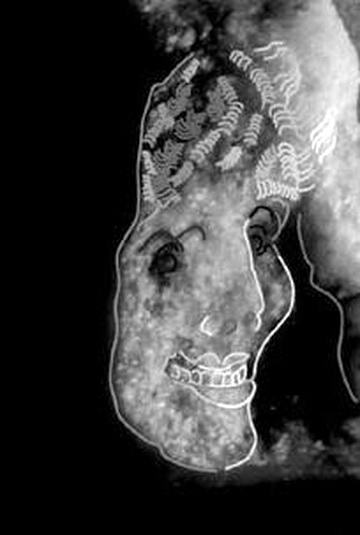 Részlet.  Az arcképet, melynek valós mérete 12 x 7 mm, a tigris körmén alakították ki. Talán volt egy tébolyult uralkodó, akinek a "Tigris körme" volt a megkülönböztető jelzője.